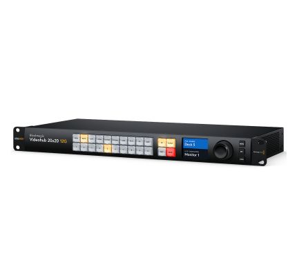 Die Blackmagic Videohub 20x20 12G ist eine fortschrittliche latenzfreie Kreuzschiene für beliebig kombinierte SD-, HD- und Ultra-HD-Videosignale, simultan auf derselben Kreuzschiene. Sie verfügt über zwanzig 12G-SDI-Eingänge, zwanzig 12G-SDI-Ausgänge plus Referenzanschlüsse und passt in eine RackEinheit. Auf dem Frontblenden-LCD sichten Sie Video vor dem Routing. Auch kann man dort Routing-Labels und Videonormen deutlich ablesen. Die Signalverteilung lässt sich direkt per Tastendruck oder mithilfe des großen Drehreglers vorgeben, der mit einer elektronischen Kupplung ausgestattet ist. Neben SDI-Reclocking und externer Steuerung per Ethernet werden alle SDI-Videonormen bis 2160p/ 60 unterstützt.