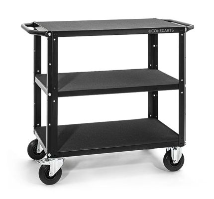 Dreistöckiger Kamerawagen komplett aus Stahl, Farbe schwarz (RAL 9005). Kleine Ausführung.