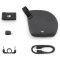 Das Ladeetui fasst ordentlich zwei Sender und einen Empfänger. Jeder Sender passt hinein, auch mit Windschutz und Magnet oder Clip – nichts muss entfernt werden. Wenn die Sender mit befestigten Clips verstaut werden, bietet der Deckel zusätzlich Platz für Magneten und das verriegelbare Audiokabel [1], sodass alles organisiert und einsatzbereit bleibt.
