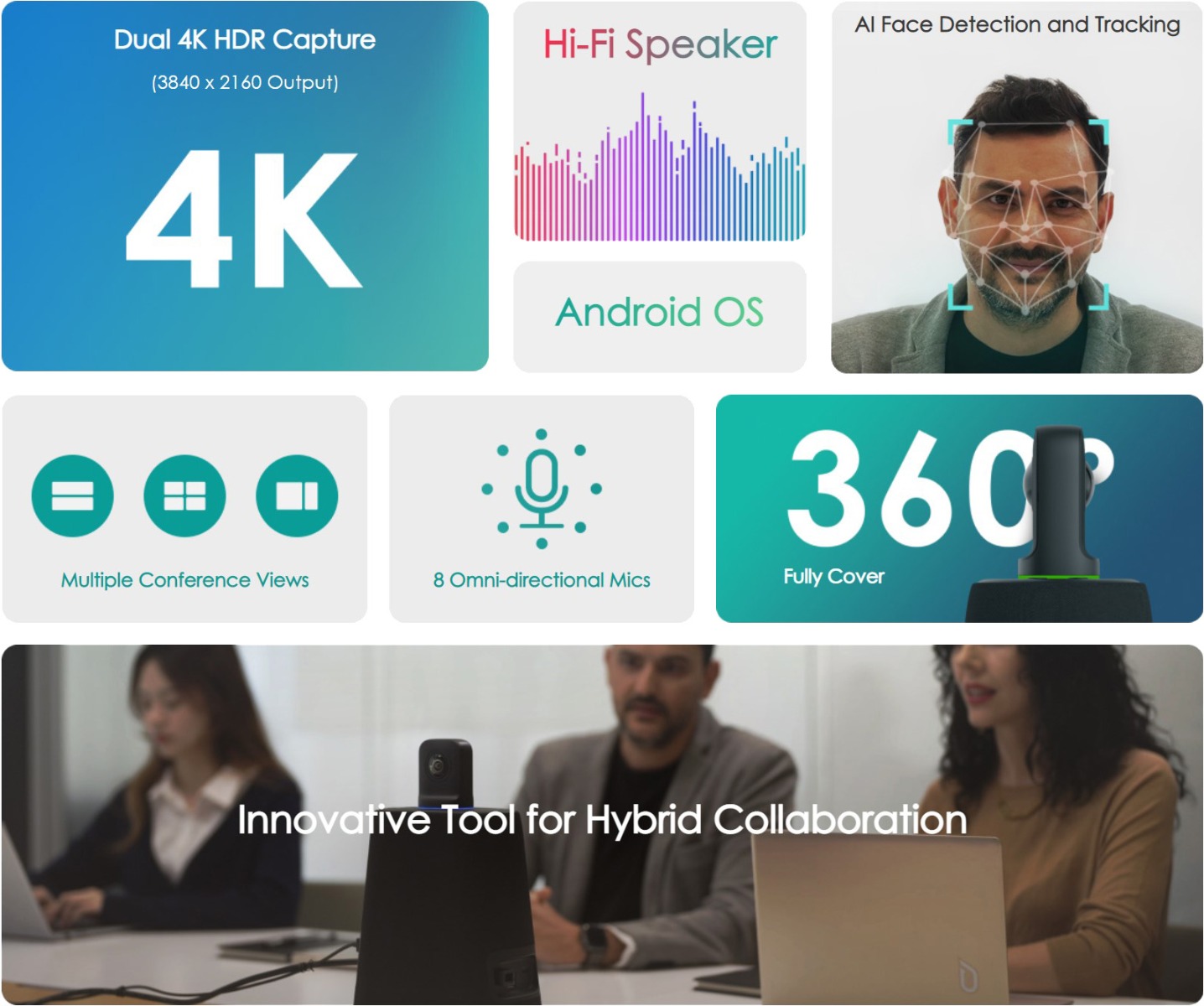 Es verfügt über ein Vollduplex-Audiosystem, das aus einem Mikrofonarray mit acht Kugel-Mikrofonen und einem 10-Watt-Hi-Fi-Lautsprecher besteh. Somit gewährleistet es nicht nur einen großen Sprachaufnahmebereich von 5 Metern, sondern auch eine erstklassige Klangqualität für eine präzise Nachrichtenübermittlung Ihrer Remote-Meetings. DAs Konferenzssystem wendet einen ausgeklügelten KI-Algorithmus mit einer leistungsstarken CPU und NPU an, um eine niedrige Latenz und eine genaue Lokalisierung, sowie automatisches Framing der sprechenden Person zu erreichen. Mit der zugrunde liegenden Deduplizierungslogik können noch mehr Teilnehmer sichtbar gemacht werden. Das Meeting Ultra Standard Konferenzsystem funktioniert unkompliziert, indem es als USB-Gerät oder als eigenständiges Videokonferenzterminal mit seinem Android-Betriebssystem an Computer angeschlossen wird. Stellen Sie eine Verbindung zu einem beliebigen 5G-Hotspot her, um überall, jederzeit und wie Sie möchten ein Meeting abzuhalten.